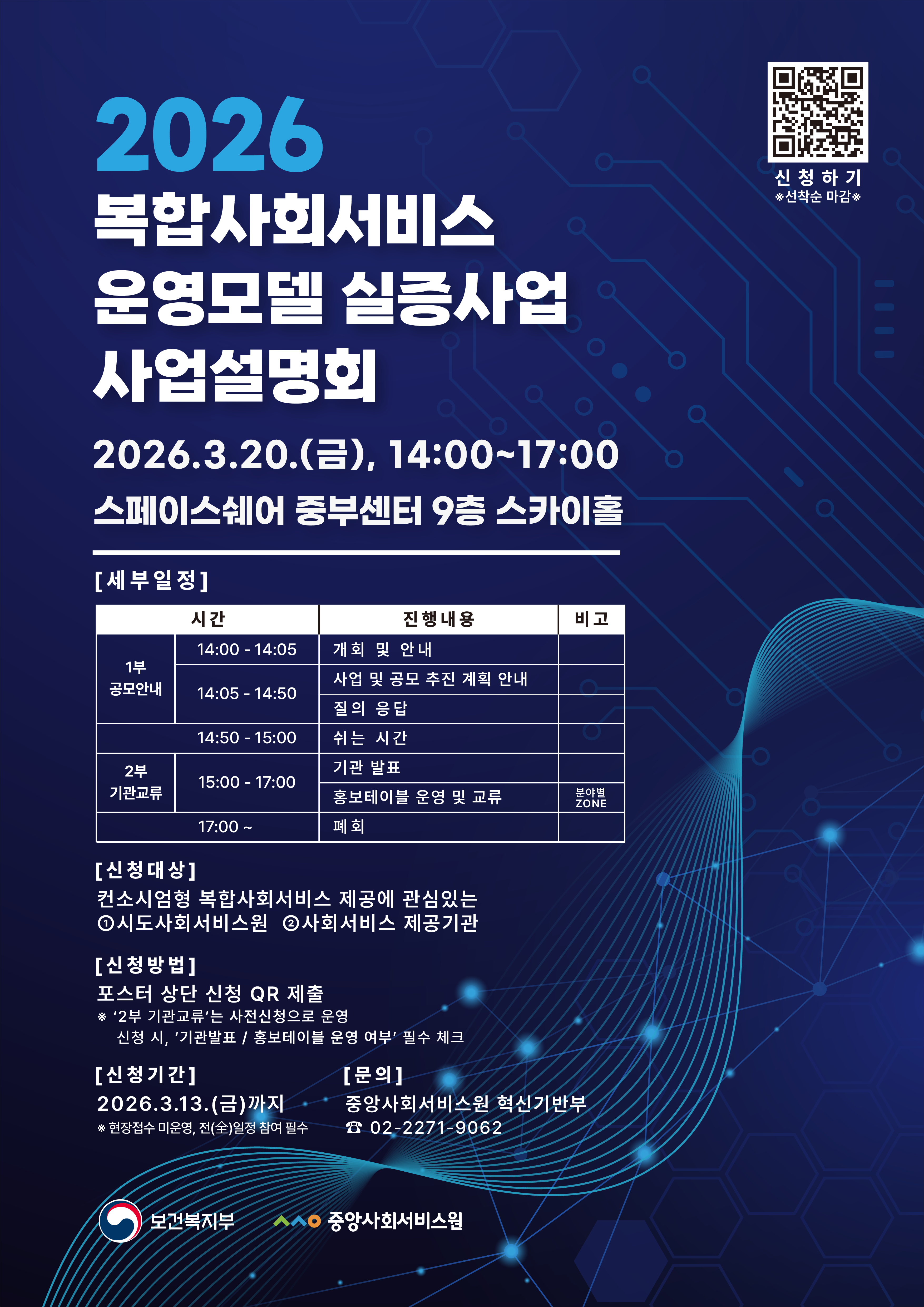 중앙사회서비스원에서는 복합적 돌봄수요에 대응하여 다양한 사회서비스를 통합적으로 제공하는 컨소시엄기반 사회서비스 모델을 개발·실증하고, 전국 확산하기 위한 '복합사회서비스 운영모델 실증사업'을 추진하고자 합니다. 본 사업설명회 개최를 통해 원활한 사업 운영을 위한 공모 안내와 사회서비스원과 제공기관 교류 시간을 마련하오니, 관심있는 분들의 많은 참여 부탁드립니다. ◎ 행 사 명: 복합사회서비스 운영모델 실증사업 설명회 ◎ 행사일시: 2026. 3. 20.(금), 14:00 ~ 17:00 ◎ 행사장소: 스페이스쉐어 중부센터 9층 스카이홀(서울시 중구 장충단로 247 굿모닝시티몰) ◎ 주요내용: 공모 설명, 기관 발표, 홍보테이블 운영, 사서원-제공기관 간 교류 등 ◎ 신청기한: 2026. 3. 13.(금) 까지 ◎ 신청방법: 신청 페이지를 통한 접수 (참가자별 개별신청, 현장등록 미운영) ※ 신청 URL: 웹포스터 신청QR 스캔, https://naver.me/GjyMRf91 ◎ 문 의: 중앙사회서비스원 혁신기반부(☎02-2271-9062)